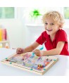 Acest joc stimulează dezvoltarea motricității fine, coordonarea mână-ochi, recunoașterea culorilor și învățarea numerelor, fiind ideal pentru activități educative inspirate de metoda Montessori. Designul colorat cu elemente de parc de distracții captează atenția copiilor și îi încurajează să exploreze și să rezolve provocarea labirintului.